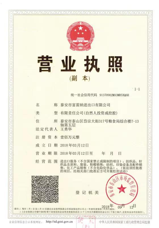 泰安市富雷纳进出口有限公司是染色、纺纱、织布、整理一体化的毛纺织品生产公司。公司座落于中外闻名的泰山脚下,位于一山一水一圣人的文化中轴线上,南距孔子故里80公里,北距济南遥墙机场90公里,地理位置优越,交通便利。公司秉承着“德载品质,追求卓越”的核心理念。以“从严求实,至诚至善”的企业精神,利用羊绒羊毛的天然特性,结合环保健康的植物纤维,开发出了上千个花色产品。主要产品:全山羊绒粗纺面料,毛绒混纺面料,全羊毛面料,毛化纤混纺面料,全山羊绒、羊毛围巾、披肩、毛毯,毛绒混纺围巾、毛毯等等粗纺面料。公司拥有染、纺、织、整配套设备200余台套,年生产粗纺面料100万米,围巾、披肩200万条,年产针织、机织纱线200吨。